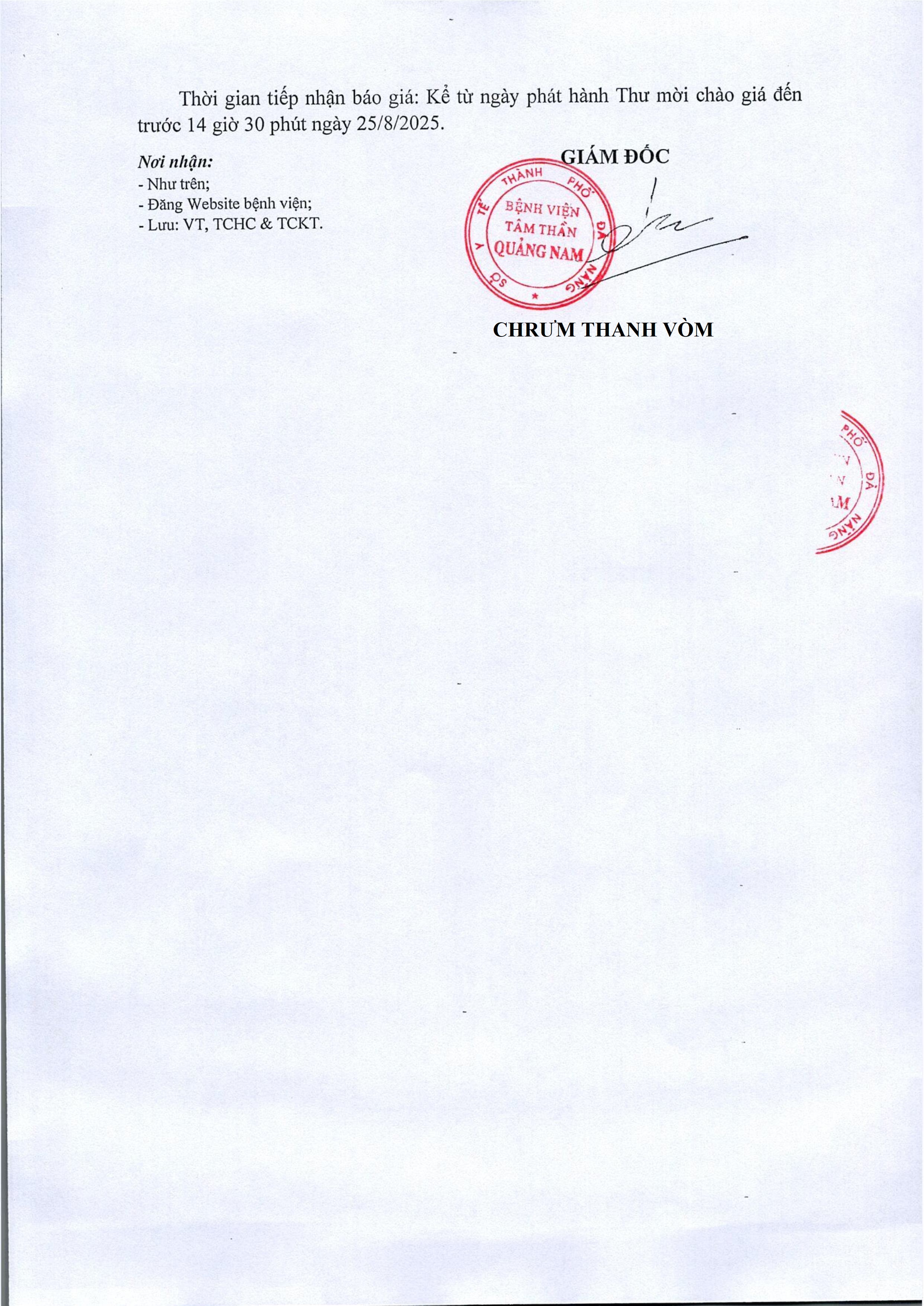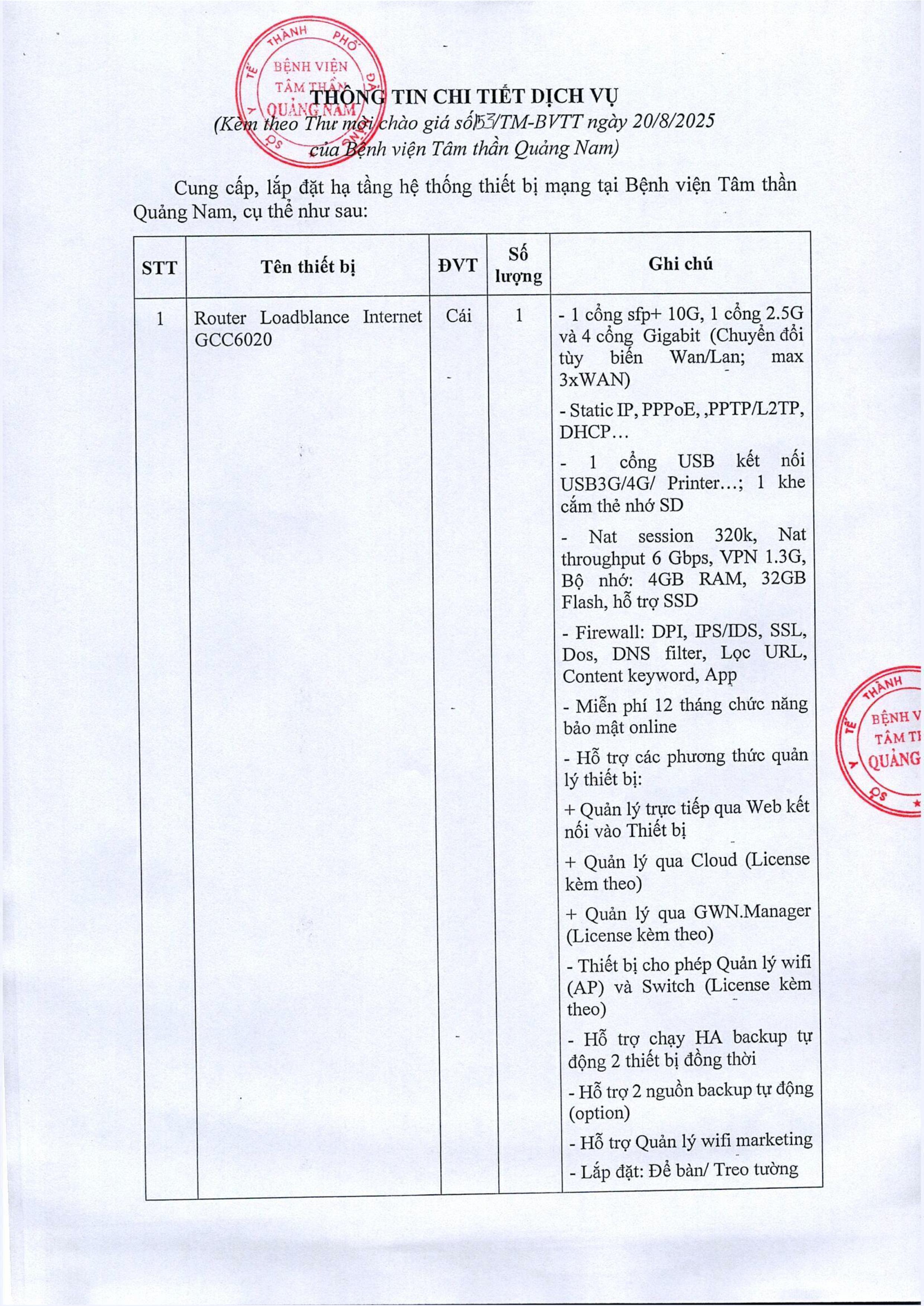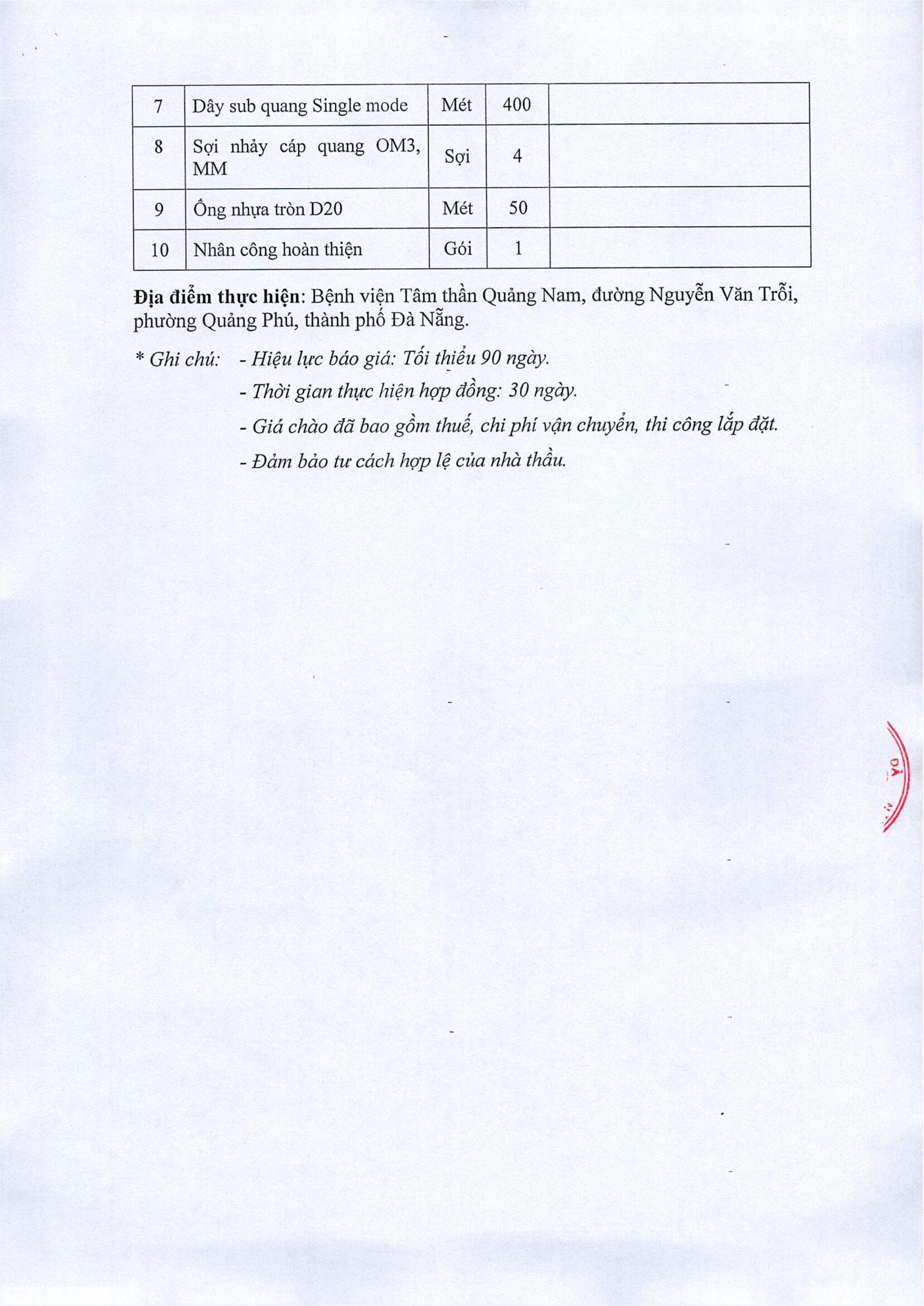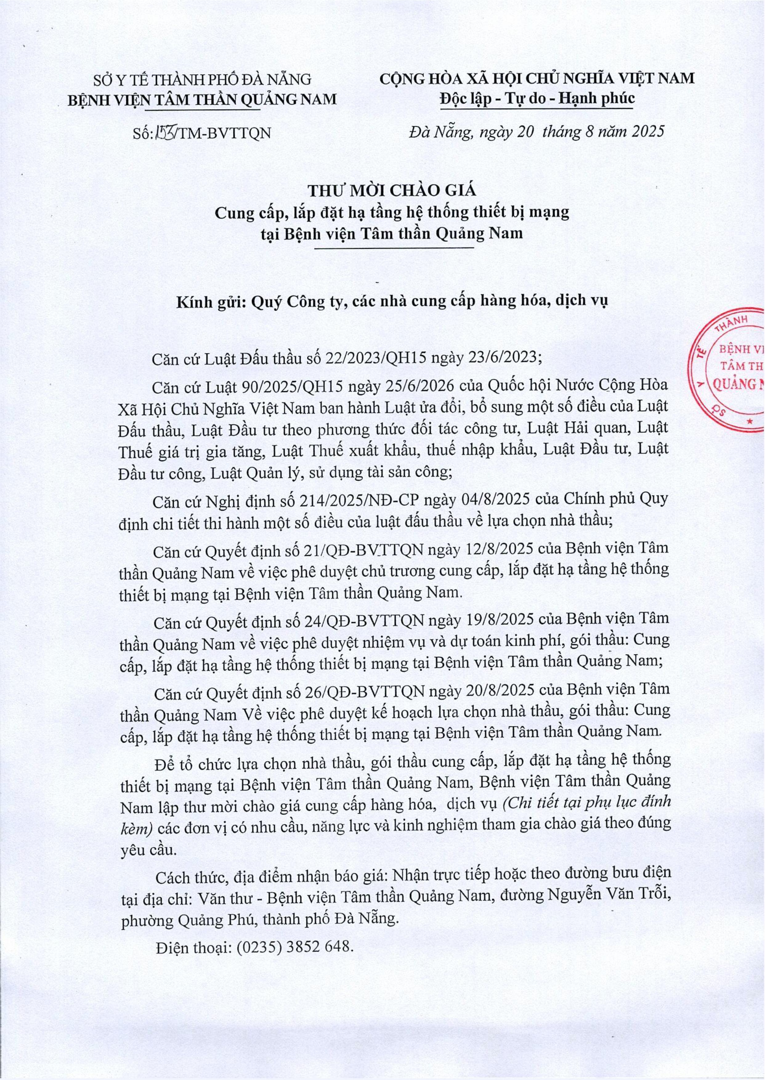 Thư mời chào giá cung cấp, lắp đặt hệ thống thiết bị mạng Thứ Tư, 20/08/2025 | 1:18 GMT+7 109 views Tin liên quan Quyết định thành lập Ban biên Tập Website Bệnh viện Tâm thần Quảng Nam Thông báo hoạt động website bệnh viện Thông báo lựa chọn Tổ chức bán đấu giá thanh lý xe ô tô 92E-0663 Công bố cơ sở khám bệnh, chữa bệnh đáp ứng yêu cầu là cơ sở thực hành trong đào tạo khối ngành sức khỏe