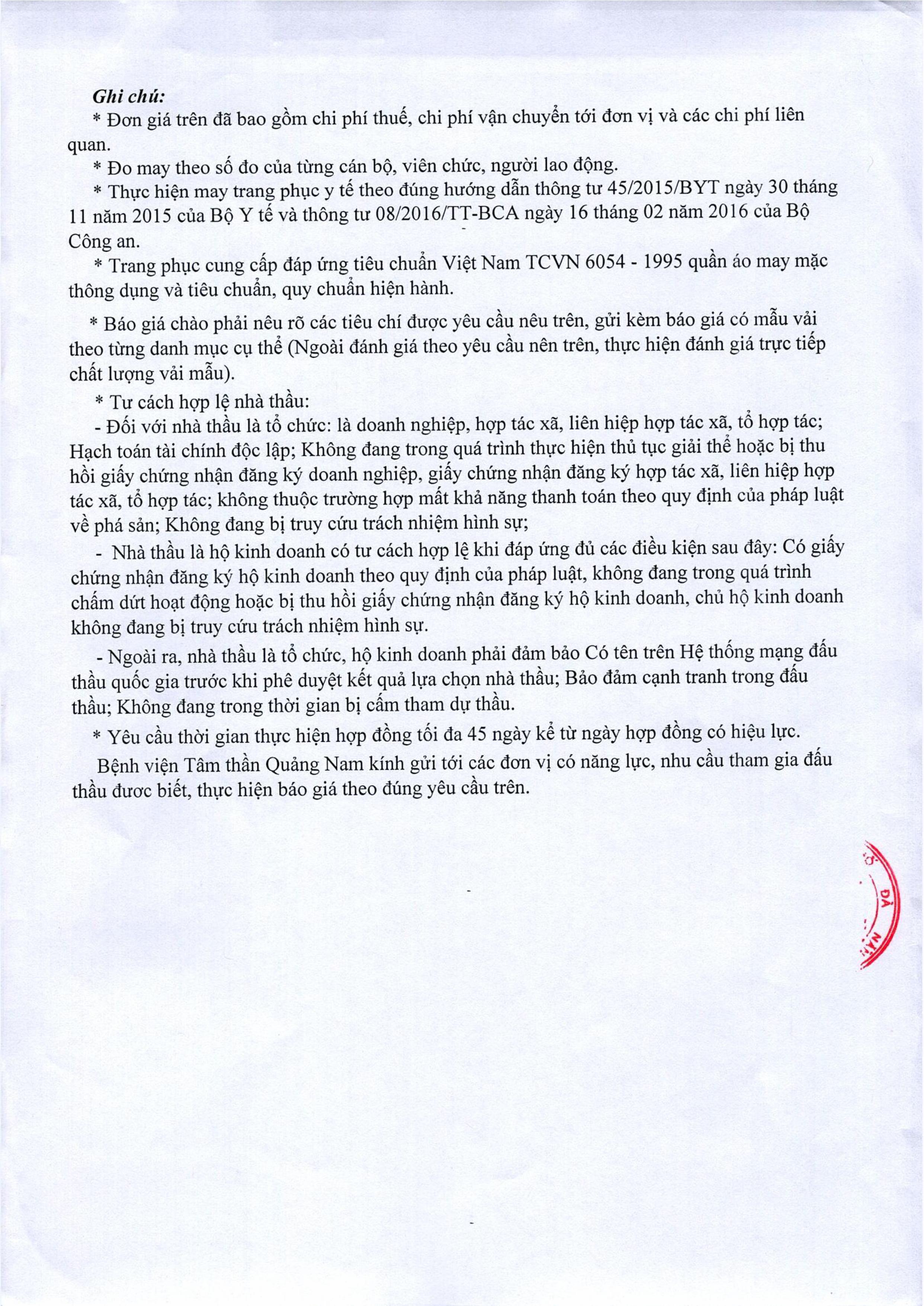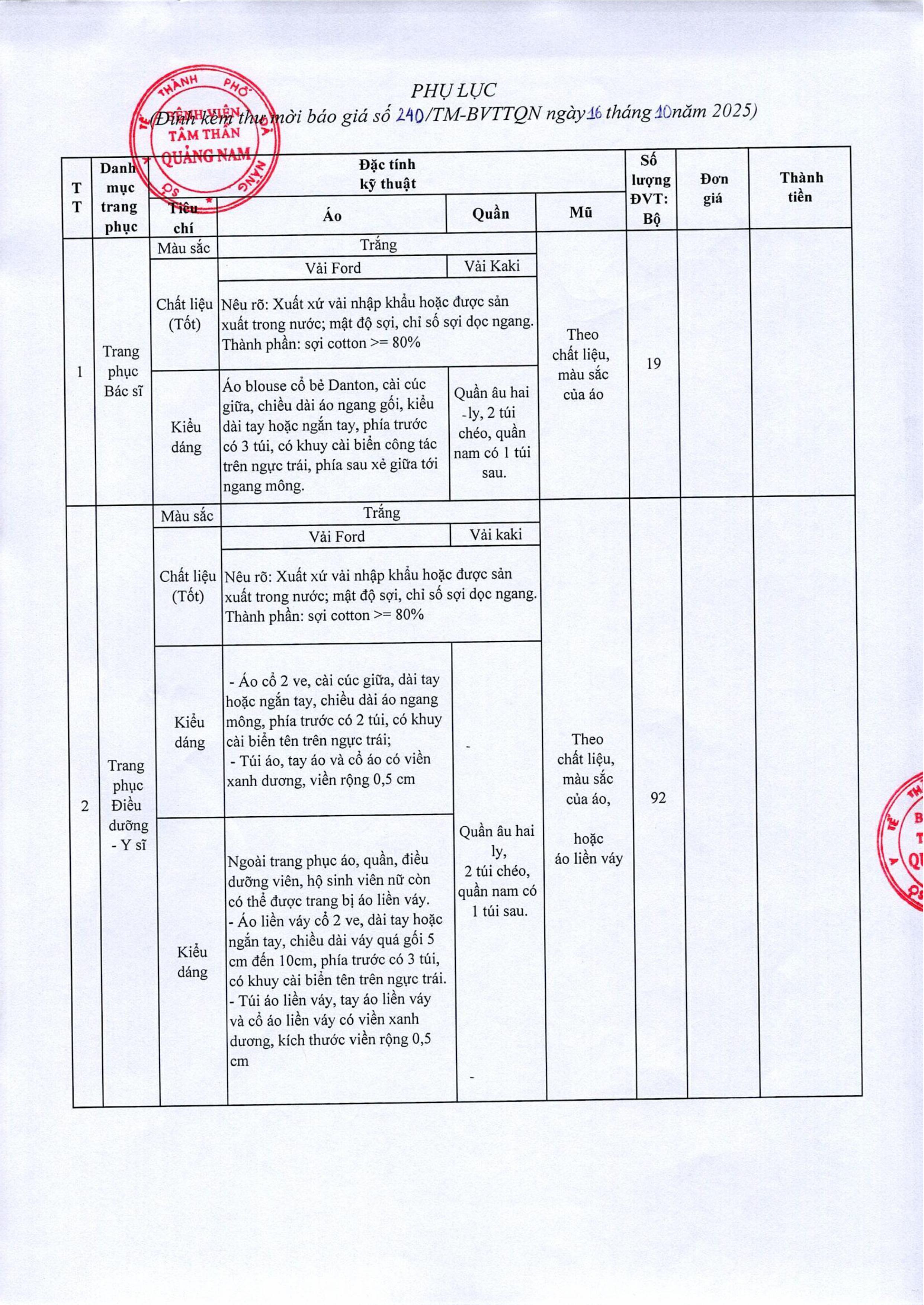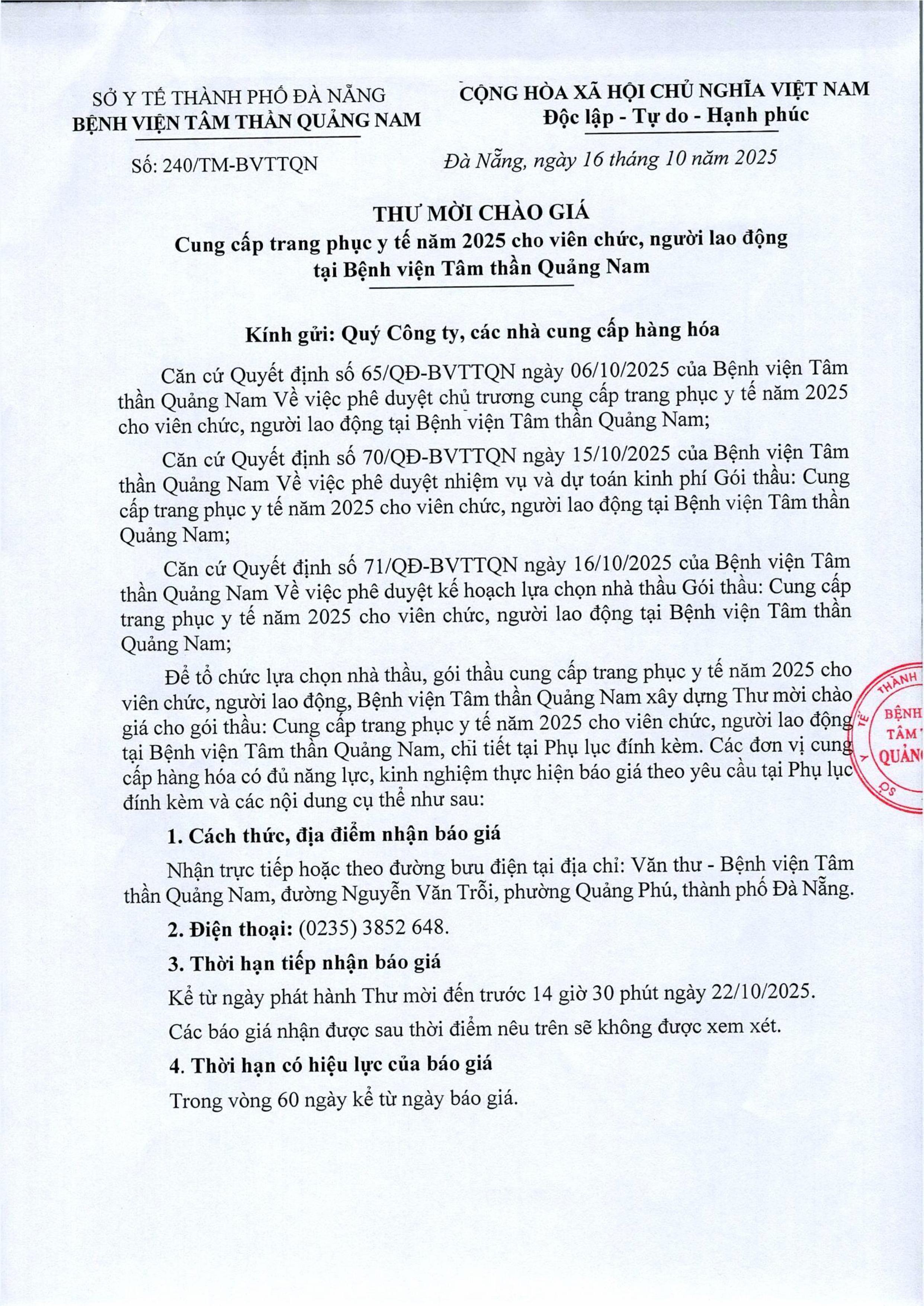 Thư mời chào giá trang phục y tế cho viên chức, người lao động năm 2025 để lựa chọn nhà thầu Thứ Năm, 16/10/2025 | 2:27 GMT+7 249 views Tin liên quan Thông báo lựa chọn Tổ chức bán đấu giá thanh lý xe ô tô 92E-0663 Thư mời chào giá mua sắm hóa chất xét nghiệm, thiết bị y tế tại Bệnh viện Tâm thần Quảng Nam Thư ngỏ kêu gọi ủng hộ, giúp đỡ người bệnh điều trị nội trú tại Bệnh viện Tâm thần Quảng Nam Thư mời chào giá thuốc Generic 6 tháng cuối năm 2023