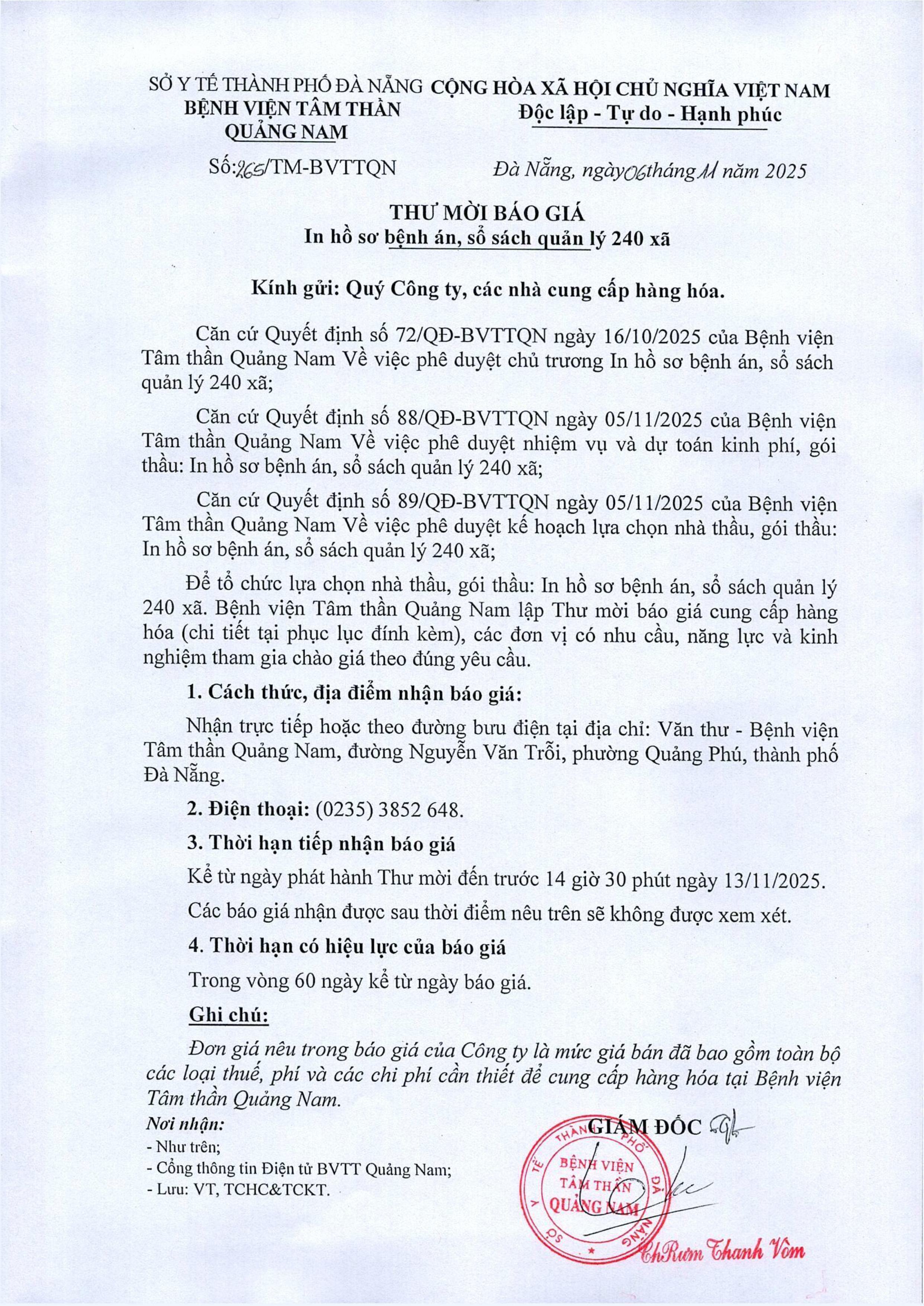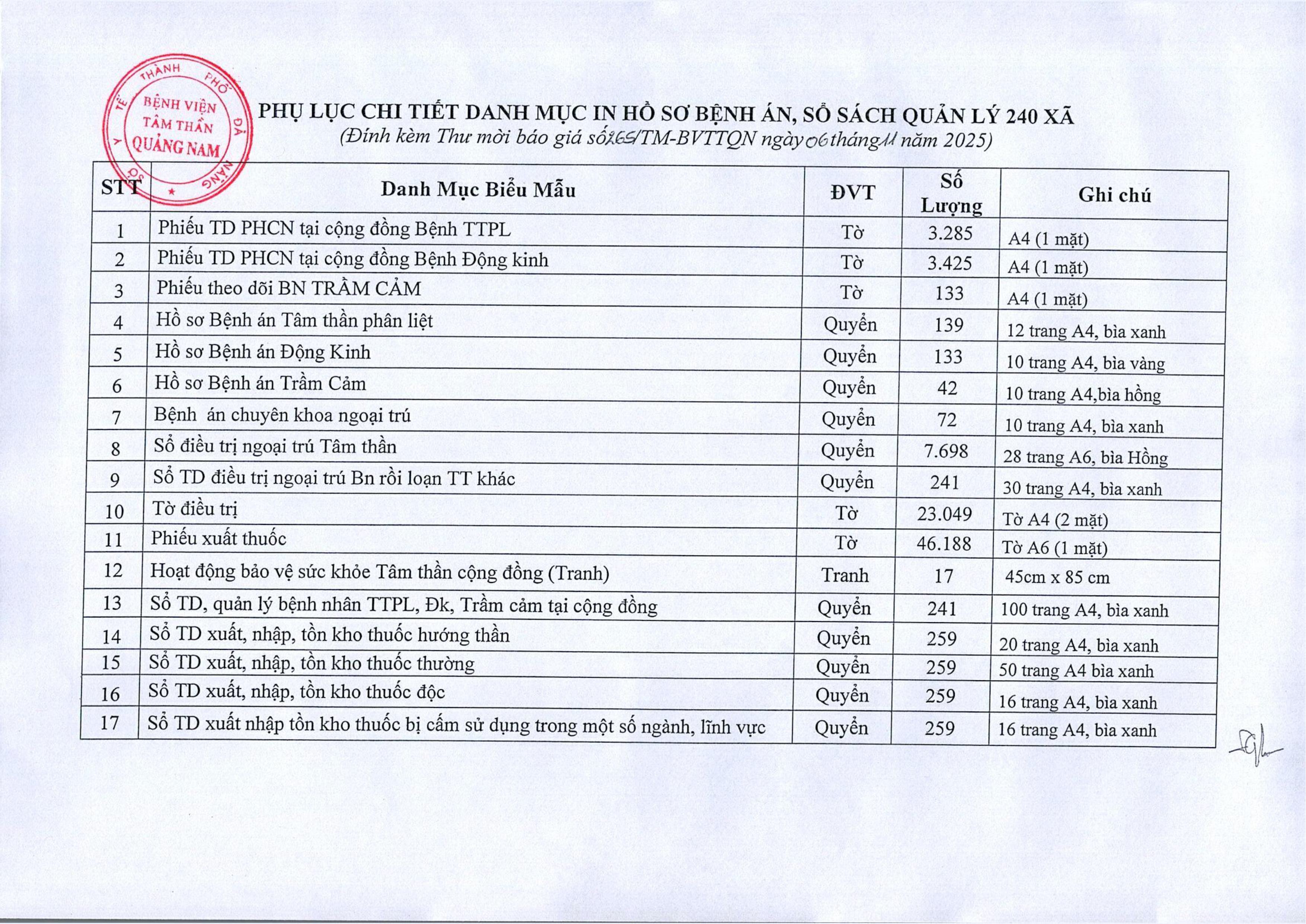Thư mời chào giá in hồ sơ bệnh án, sổ sách quản lý 240 xã Thứ Năm, 06/11/2025 | 10:28 GMT+7 7 views Tin liên quan Thư mời chào giá cung cấp, lắp đặt hệ thống thiết bị mạng THƯ MỜI BÁO GIÁ Cung cấp dịch vụ bảo vệ tại bệnh viện Thư mời chào giá thuốc, vật tư, trang thiết bị y tế Thư mời chào giá cung cấp văn phòng phẩm quý II, III, IV năm 2025