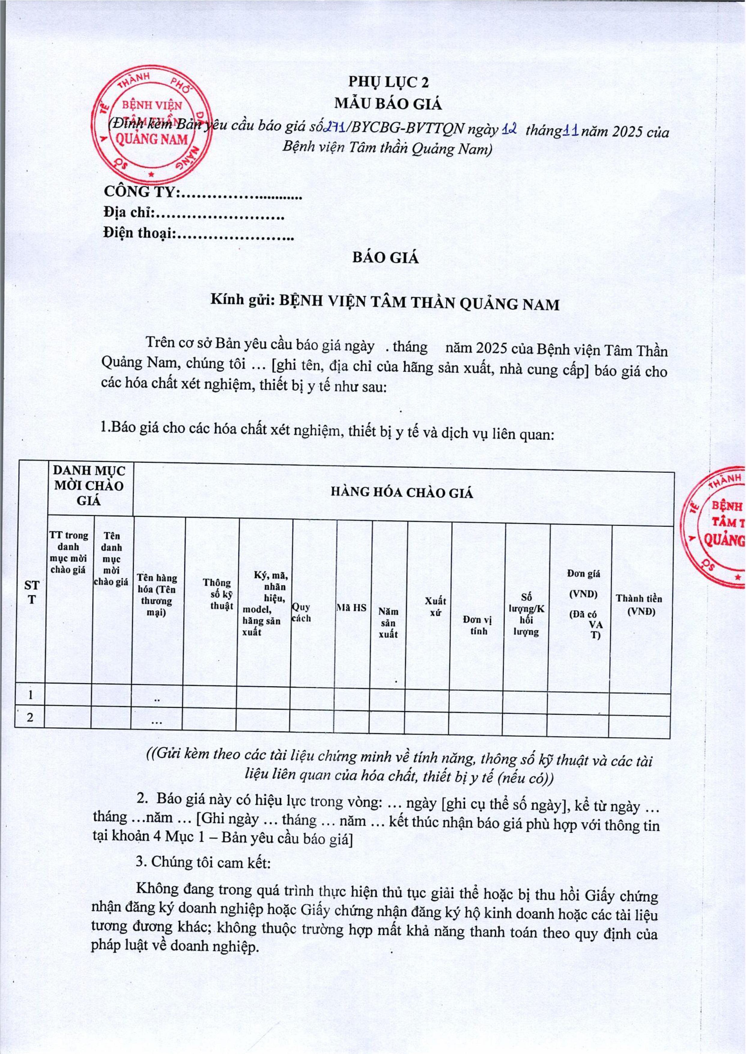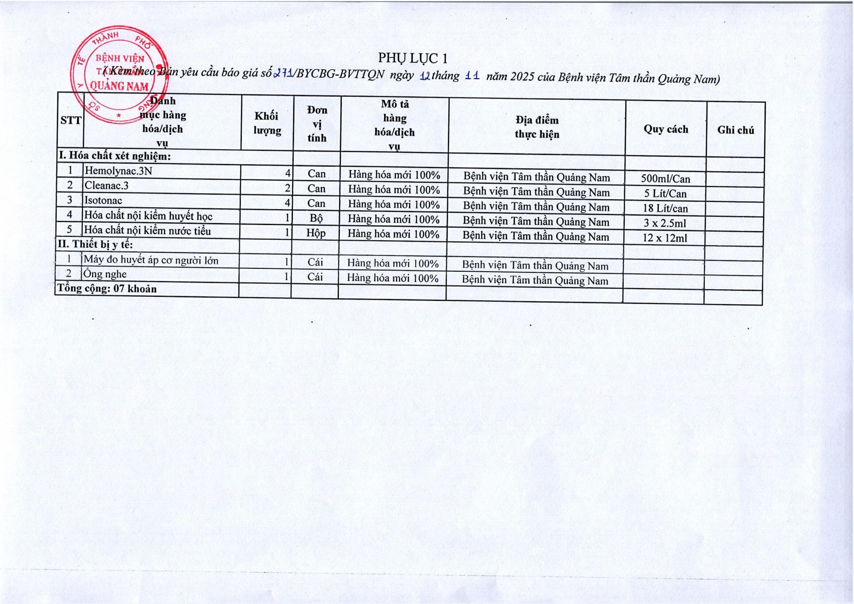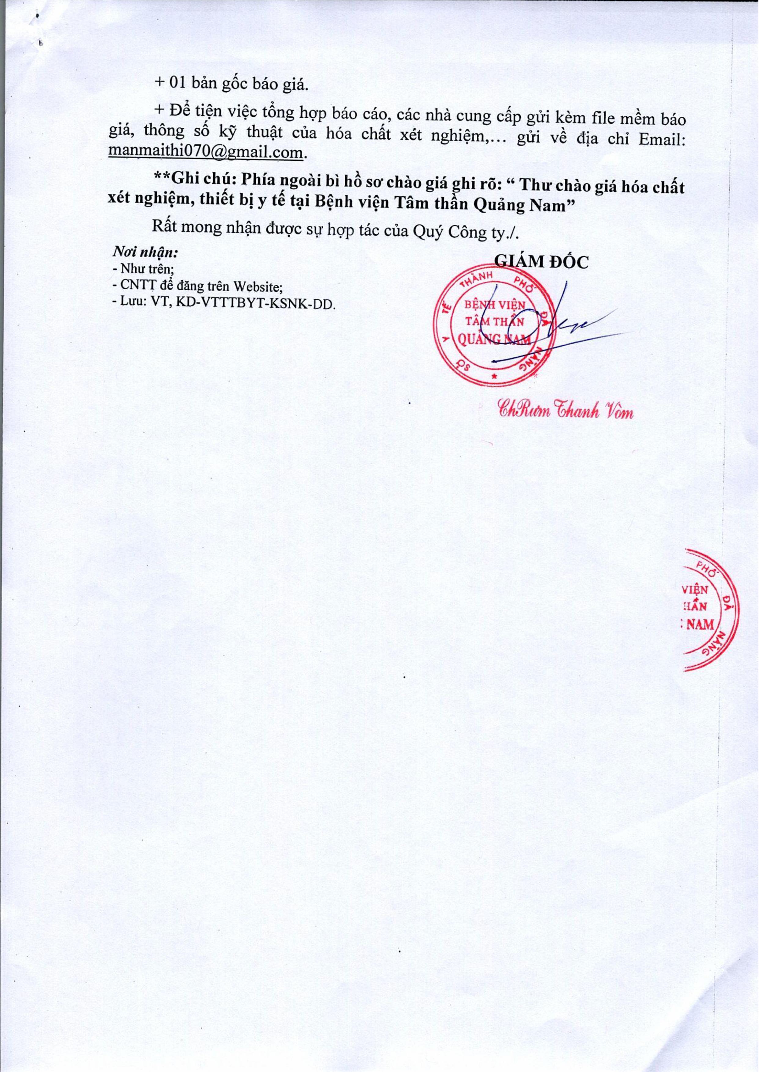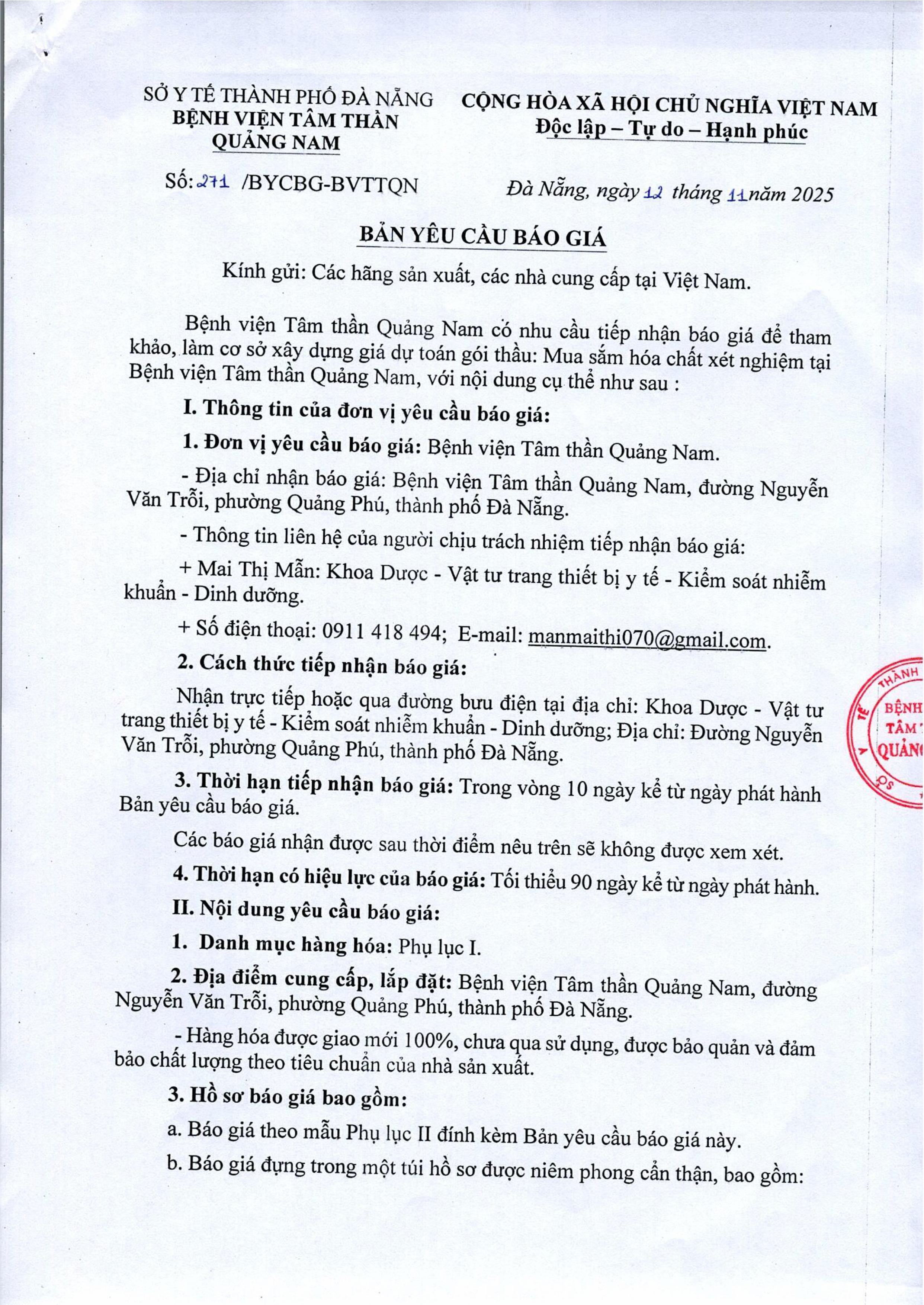 Bản yêu cầu báo giá mua hóa chất xét nghiệm Thứ Tư, 12/11/2025 | 4:26 GMT+7 6 views Tin liên quan Bản yêu cầu báo giá bảo dưỡng, bảo trì thiết bị y tế Thư mời chào giá Thi công biển tên cơ quan hành chính sự nghiệp của Bệnh viện Tâm thần Quảng Nam Thư mời chào giá thiết bị văn phòng Thừ mời chào giá vật tư y tế, hóa chất, sinh phẩm y tế, vật tư xét nghiệm