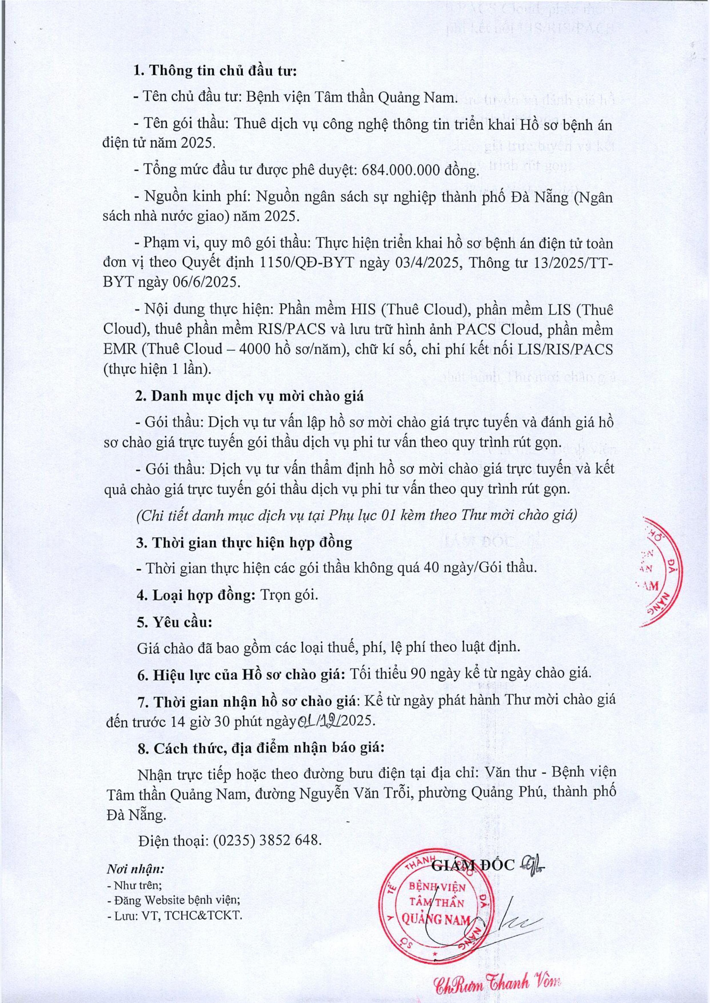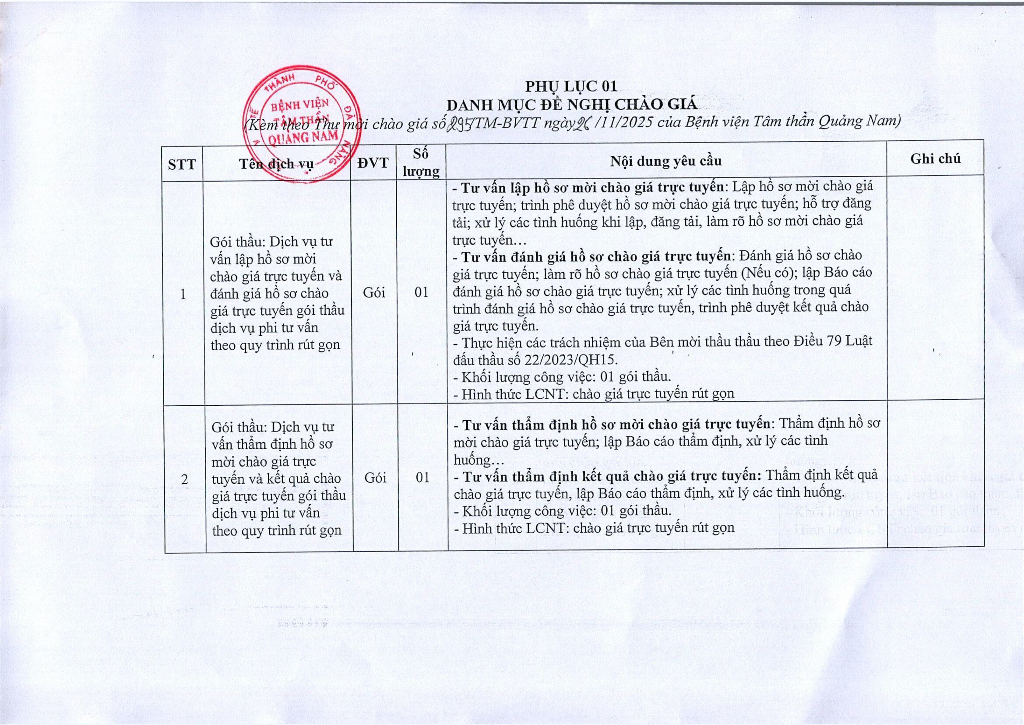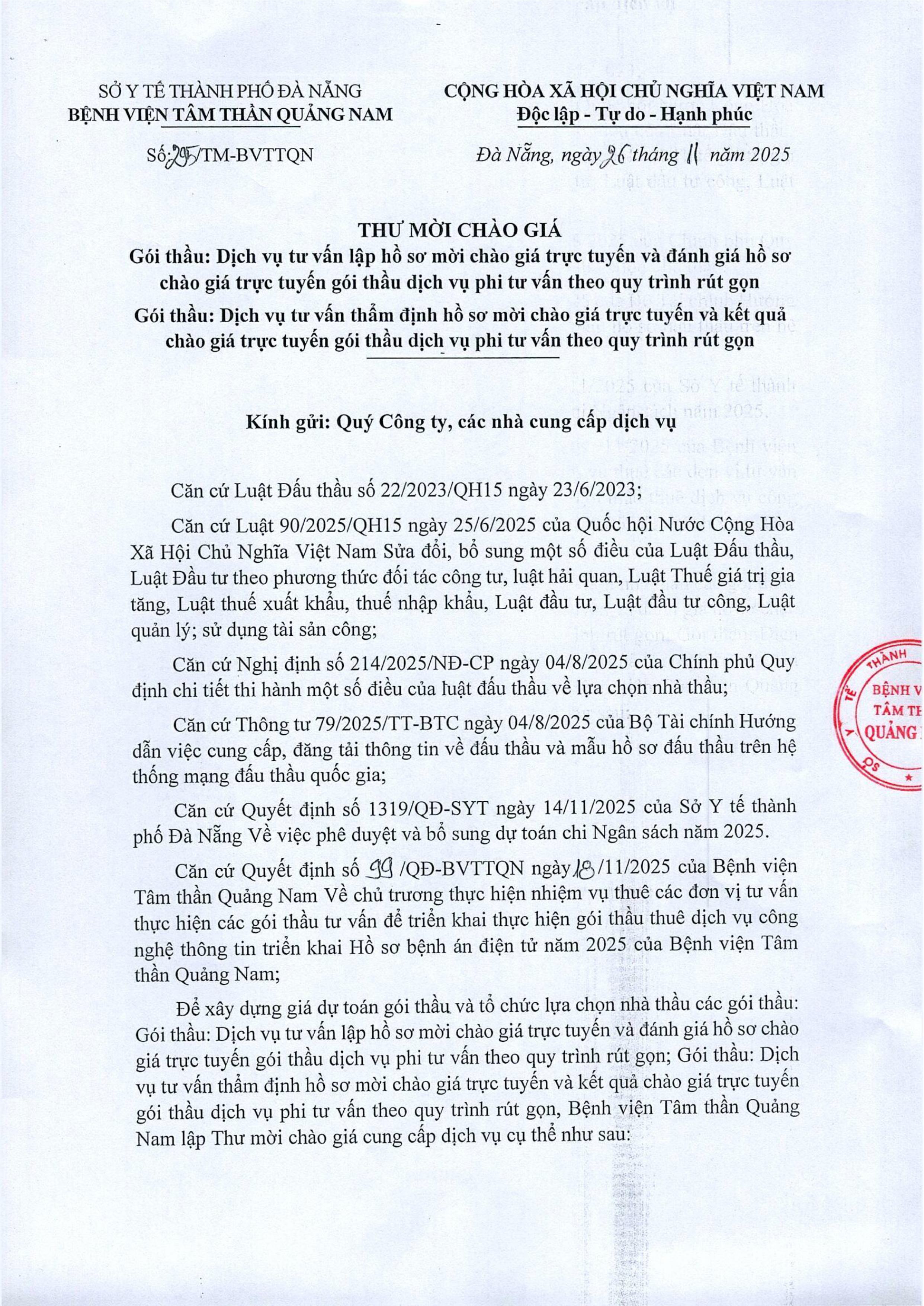 Thư mời chào giá dịch vụ tư vấn lựa chọn nhà thầu Thứ Tư, 26/11/2025 | 2:55 GMT+7 9 views Tin liên quan Thừ mời chào giá vật tư y tế, hóa chất, sinh phẩm y tế, vật tư xét nghiệm CHUNG SỐNG AN TOÀN VỚI ĐẠI DỊCH COVID-19 – Thông điệp 5K Thư mời chào giá cung cấp quầy lễ tân, bảng hiệu, bàn ký hồ sơ Thư mời chào giá mua sắm hóa chất xét nghiệm, thiết bị y tế tại Bệnh viện Tâm thần Quảng Nam