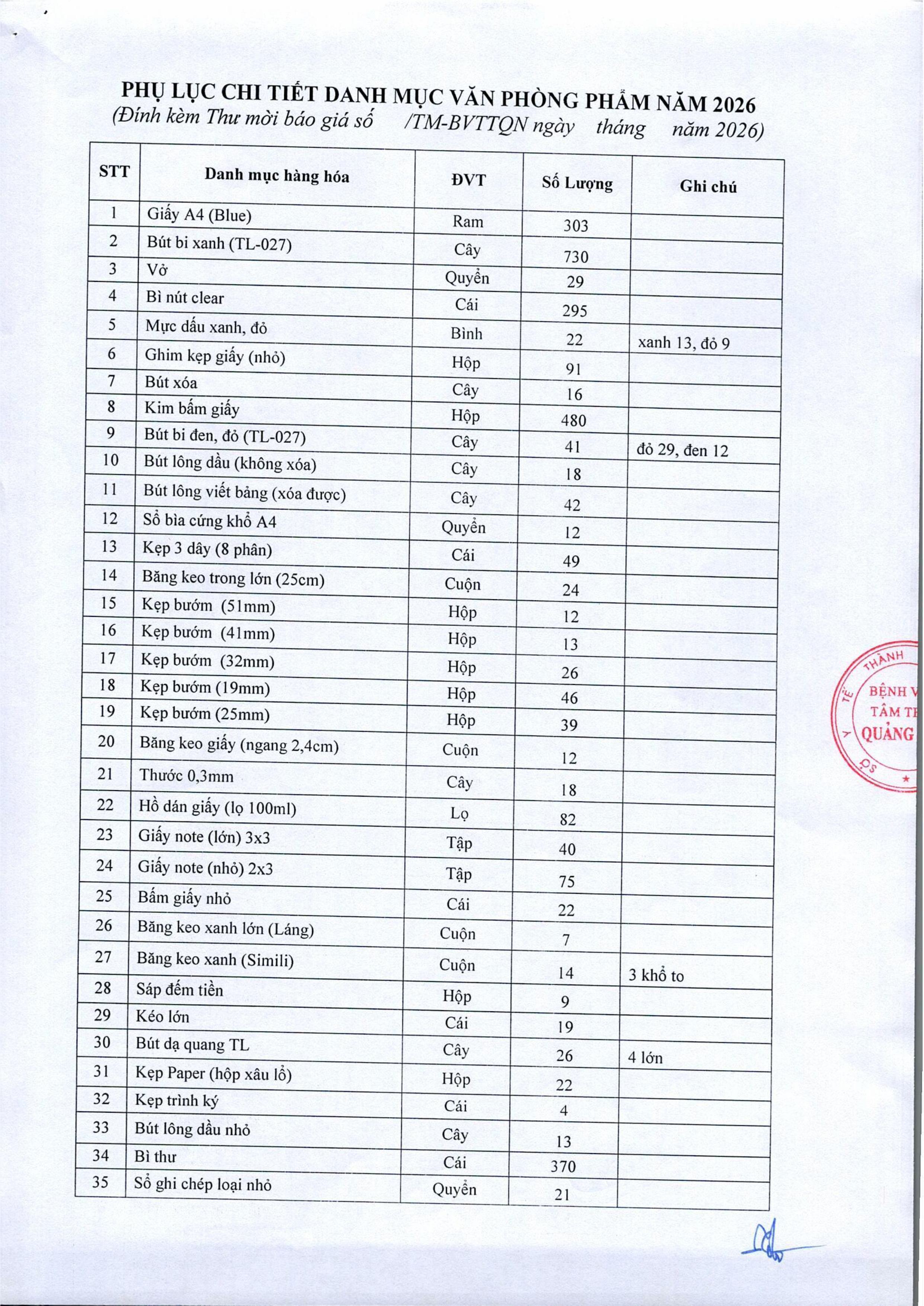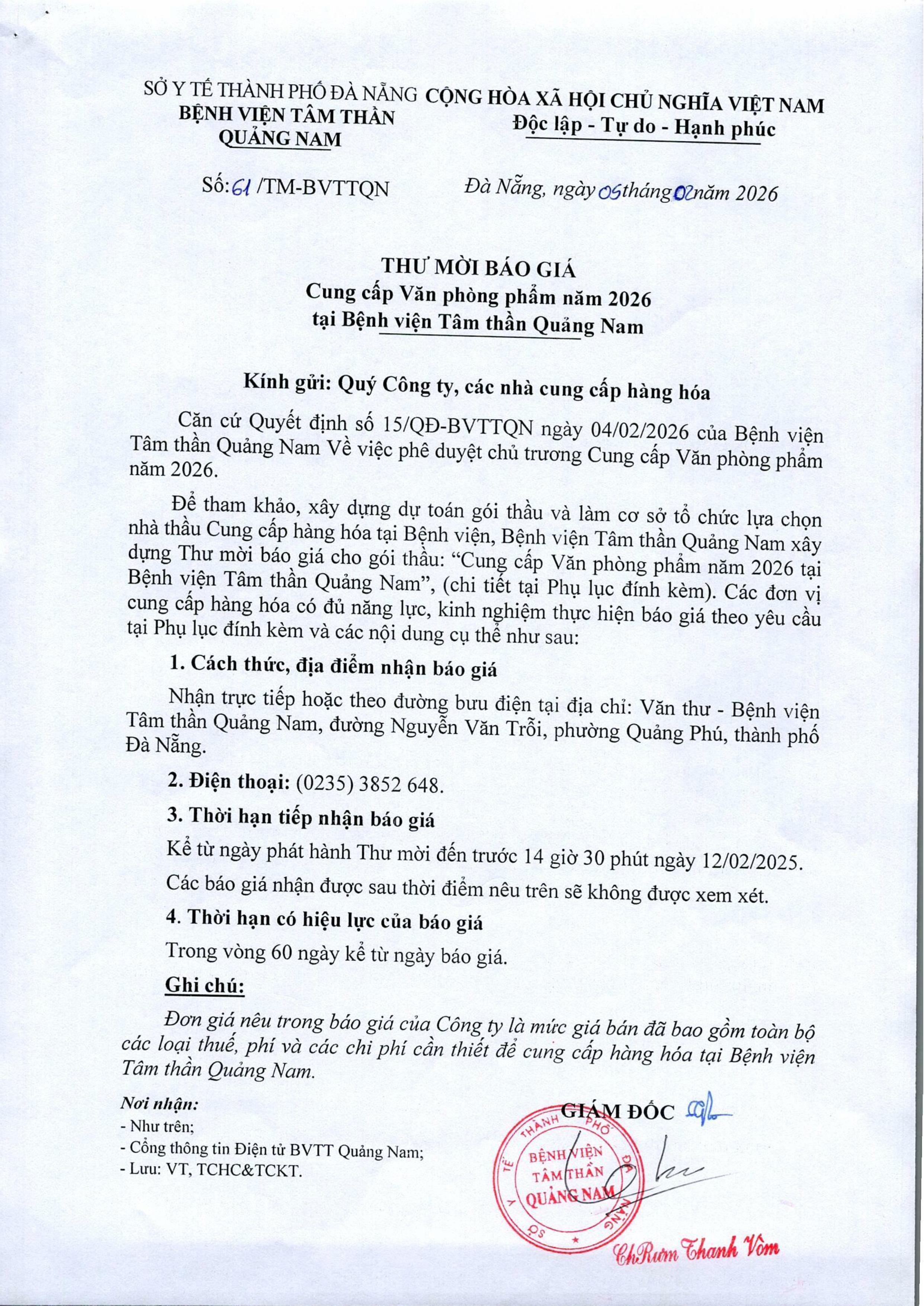 Thư mời chào giá cung cấp văn phòng phẩm năm 2026 Thứ Năm, 05/02/2026 | 9:55 GMT+7 3 views Tin liên quan Thư mời báo giá cung cấp dịch vụ bảo vệ Báo cáo tự kiểm tra, đánh giá chất lượng bệnh viện năm 2019 Thư mời chào giá hóa chất, thiết bị y tế Thư mời chào giá thuê dịch vụ vệ sinh công nghiệp tại Bệnh viện Tâm thần Quảng Nam năm 2025