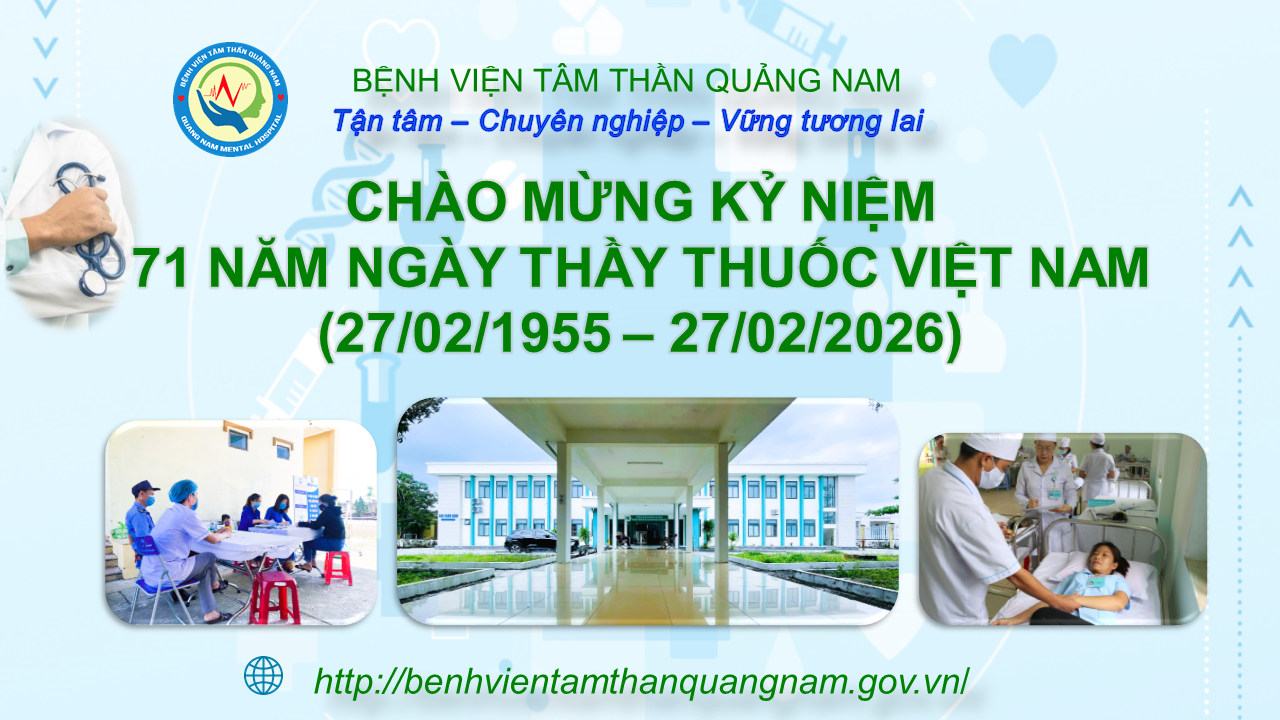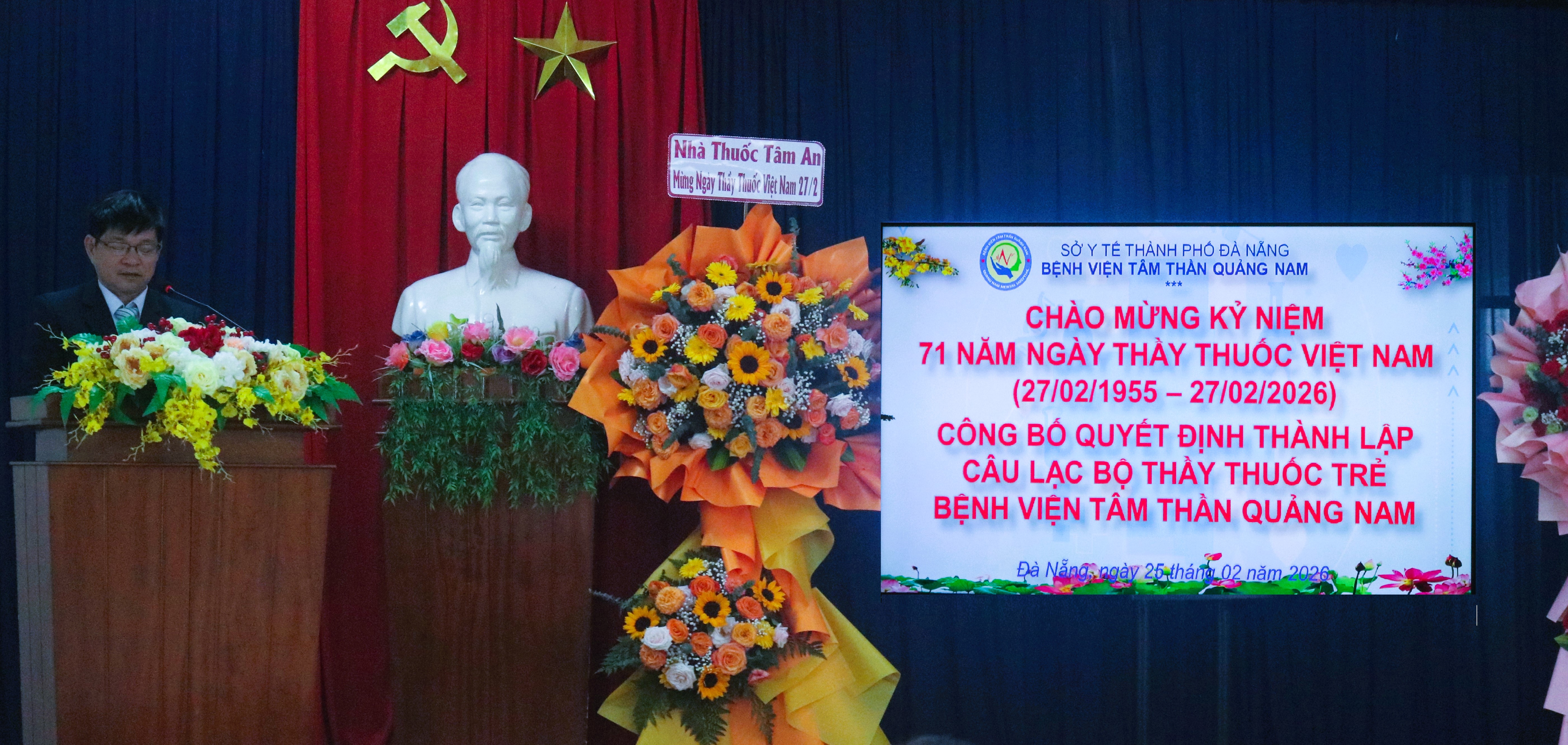 Nhân kỷ niệm 71 năm Ngày Thầy thuốc Việt Nam (27/02/1955 – 27/02/2026), chiều ngày 25/02/2026 tại Hội trường Bệnh viện Tâm thần Quảng Nam đã long trọng tổ chức chương trình chào mừng kỷ niệm 71 năm Ngày Thầy thuốc Việt Nam (27/02/1955 – 27/02/2026) và công bố Quyết định thành lập Câu lạc bộ Thầy thuốc trẻ Bệnh viện Tâm thần Quảng Nam. Đây là dịp để tri ân những cống hiến thầm lặng và vinh danh những cá nhân xuất sắc trong sự nghiệp chăm sóc sức khỏe Nhân dân.