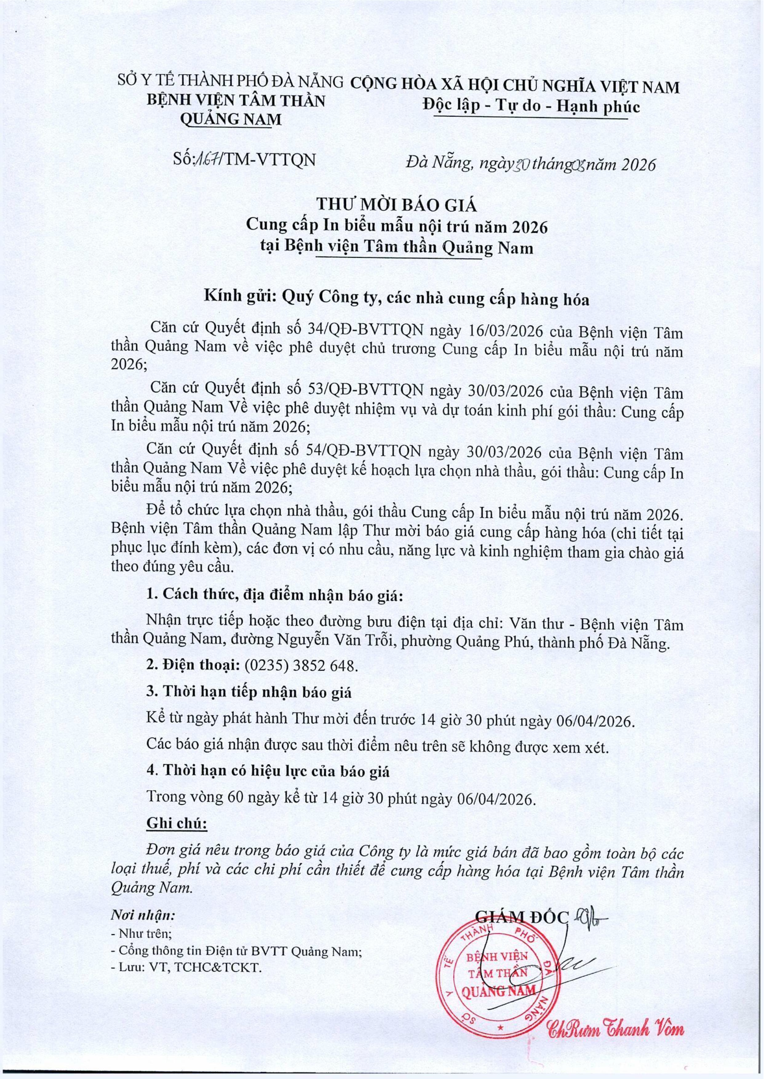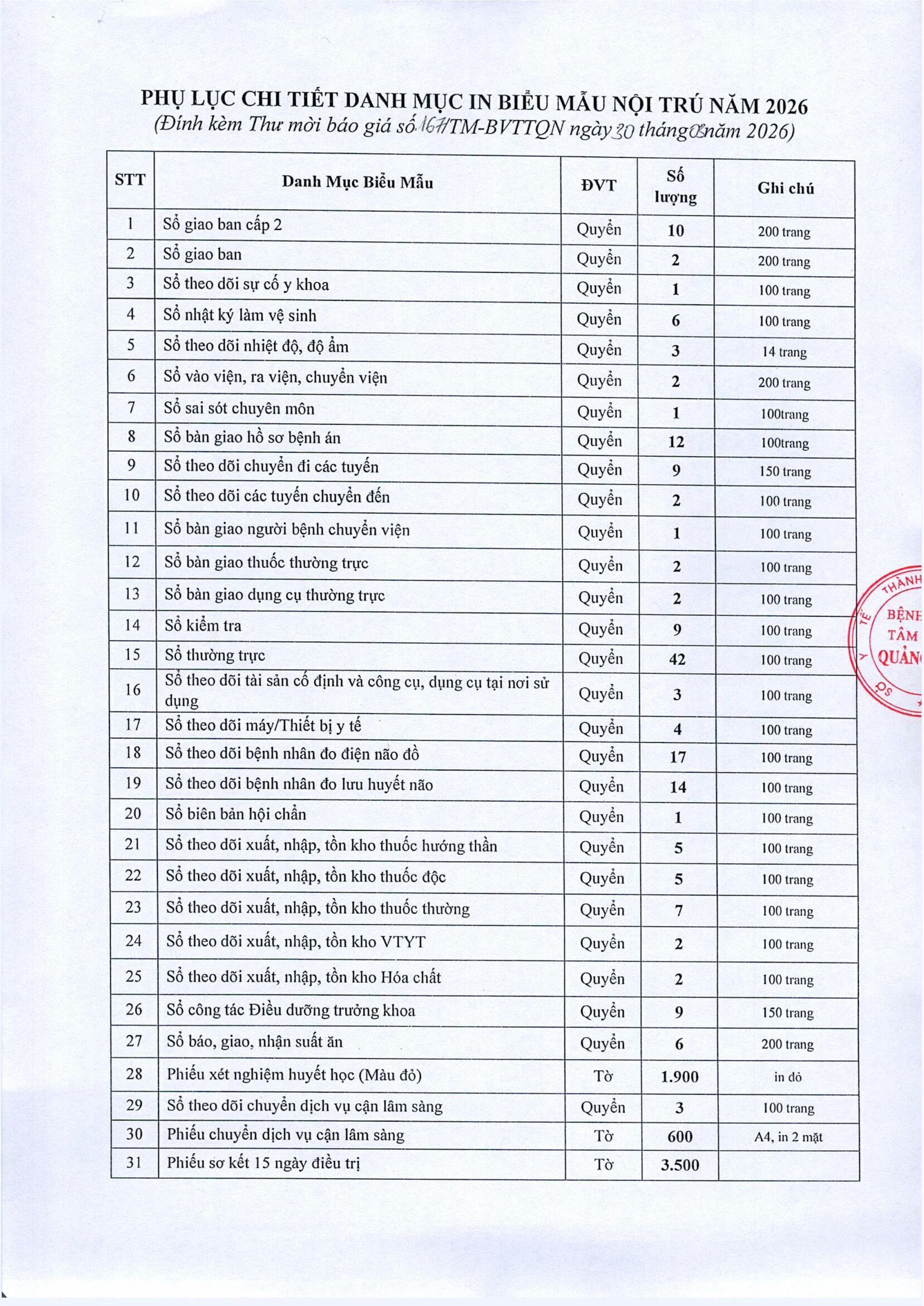 Thư mời chào giá cung cấp in biểu mẫu nội trú năm 2026 Thứ Năm, 02/04/2026 | 2:58 GMT+7 3 views Tin liên quan Thư mời báo giá cung cấp sữa bồi dưỡng độc hại hiện vật năm 2026 Thư mời chào giá dịch vụ tư vấn lựa chọn nhà thầu Thư mời chào giá Cung cấp văn phòng phẩm năm 2026 Thư mời chào giá cung cấp biểu mẫu nội trú năm 2025