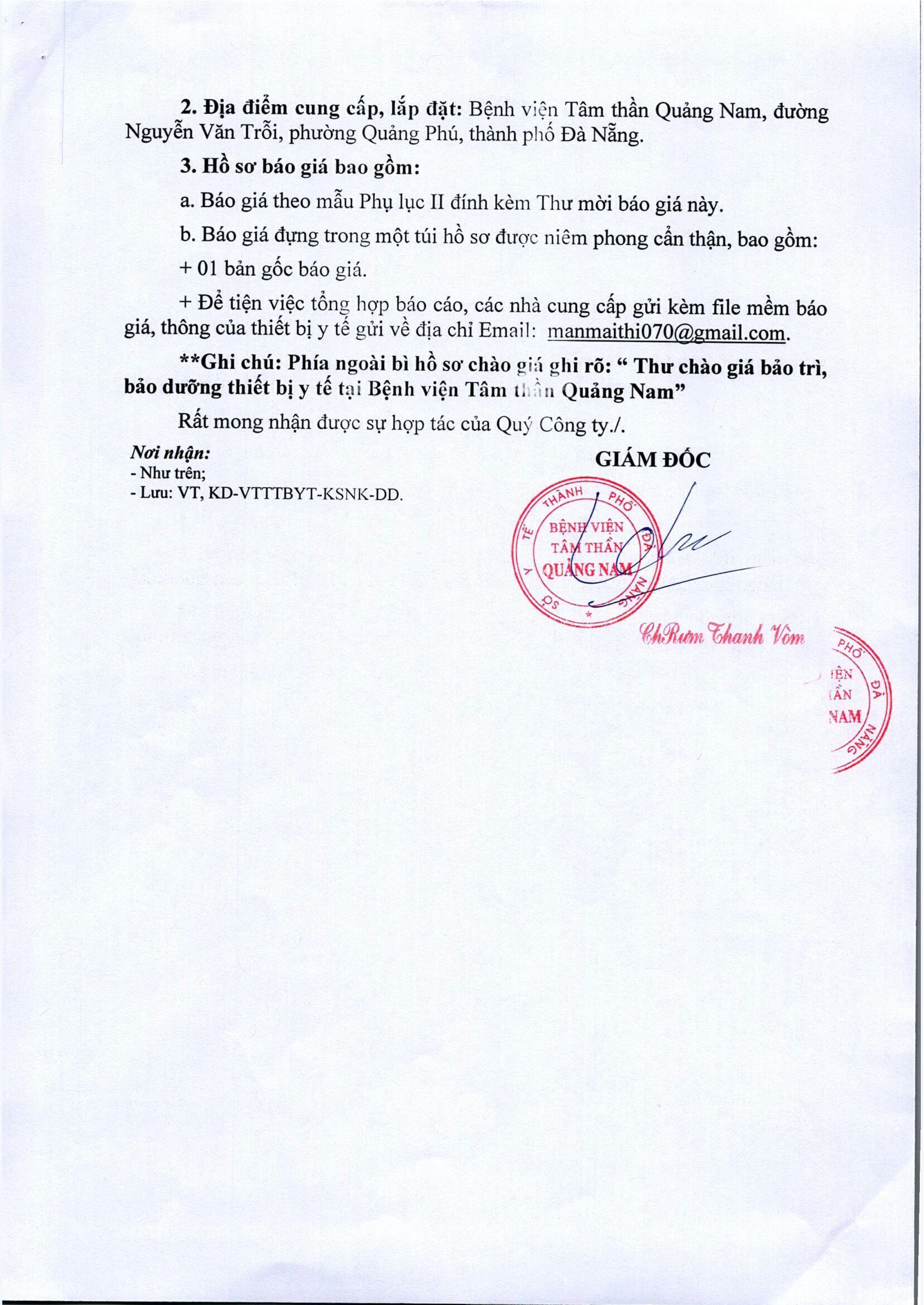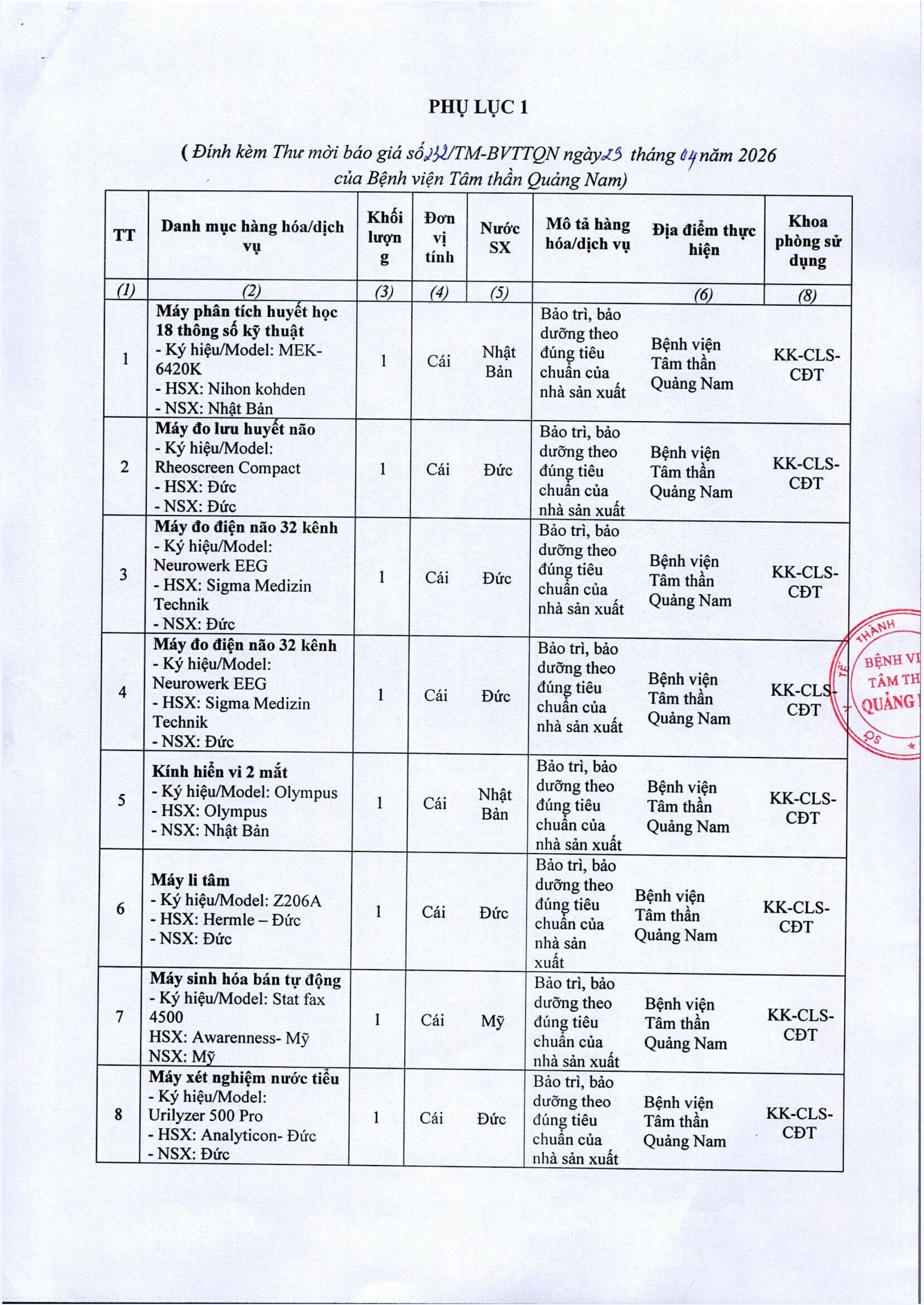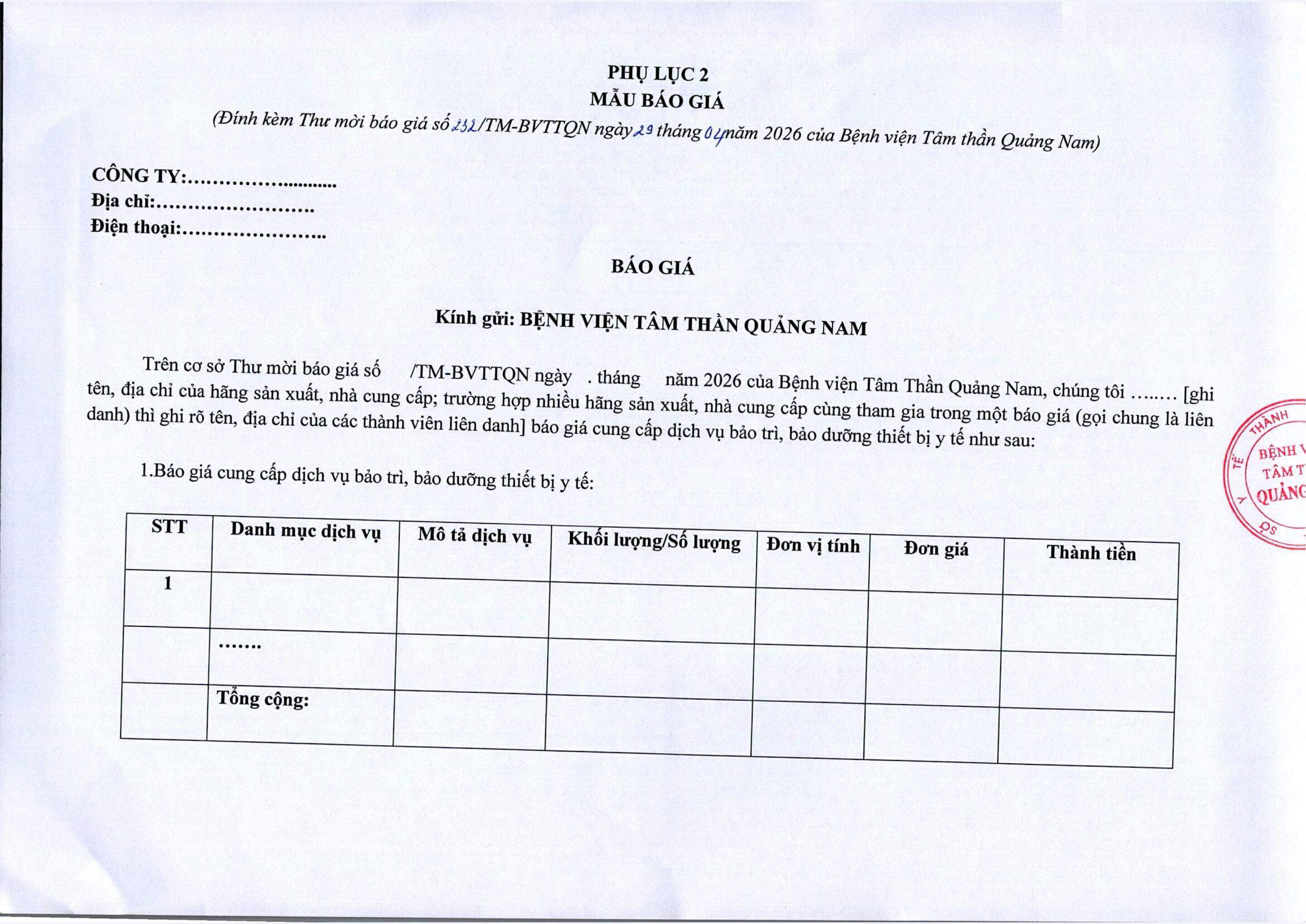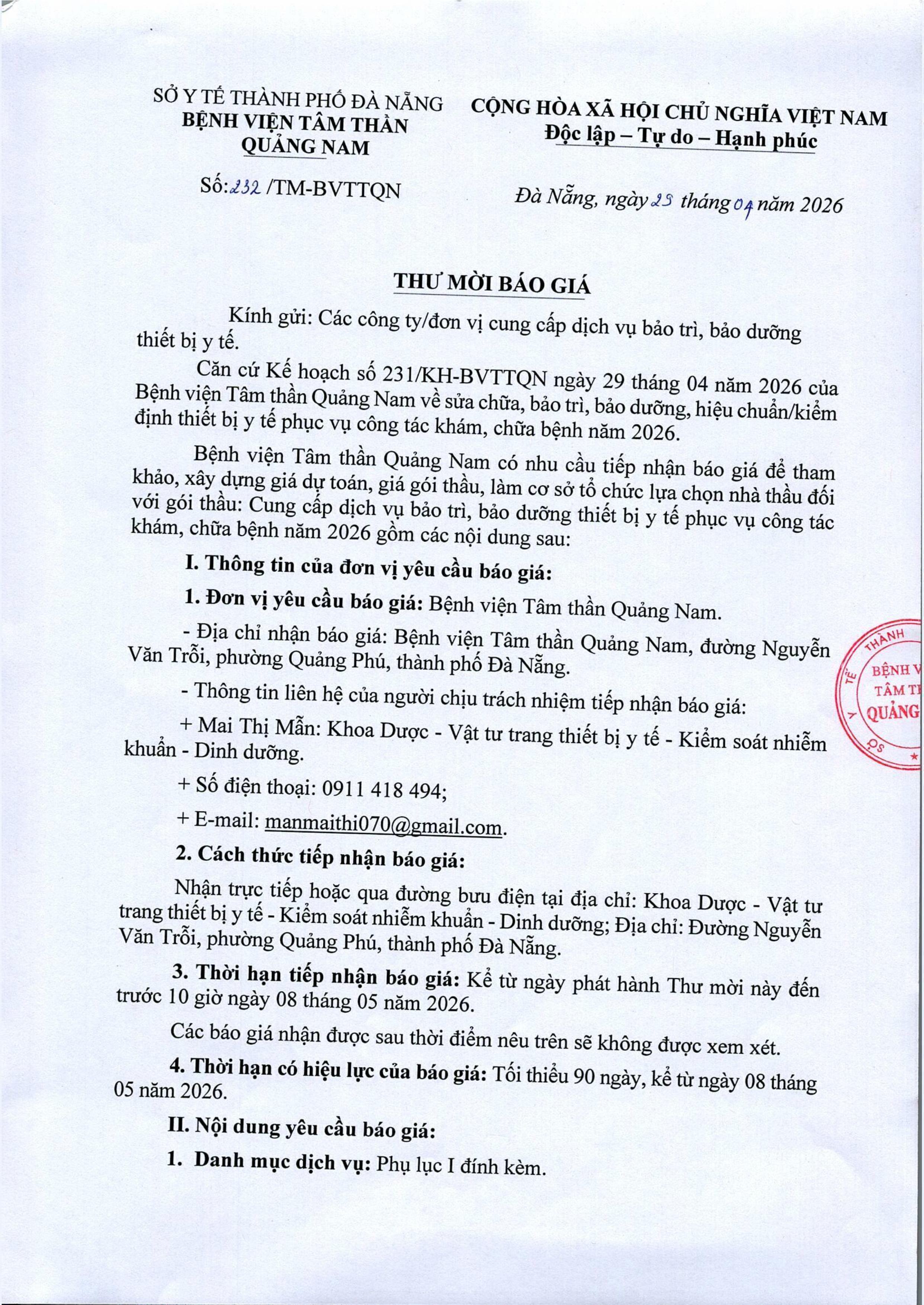 Thư mời báo giá sửa chữa, bảo trì, bảo dưỡng, hiệu chuẩn/kiểm định thiết bị y tế Thứ Tư, 29/04/2026 | 3:36 GMT+7 3 views Tin liên quan Báo cáo tự kiểm tra, đánh giá chất lượng bệnh viện năm 2019 Thư mời chào giá hóa chất, thiết bị y tế Thư mời chào giá cung cấp văn phòng phẩm năm 2026 Bộ tiêu chí bệnh viện an toàn phòng chống dịch Covid-19 và các dịch bệnh viêm đường hô hấp cấp